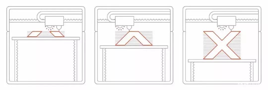 使MJ獨(dú)特的另一個方面是材料如何沉積(并因此固化)?;旧希琈J打印機(jī)沿著X軸載體從多個打印頭噴射樹脂,X軸載體在不斷變化的打印件上來回移動。為了幫助可視化設(shè)備的運(yùn)動,請參考2D掃描儀中的光源或汽車的雨刮。